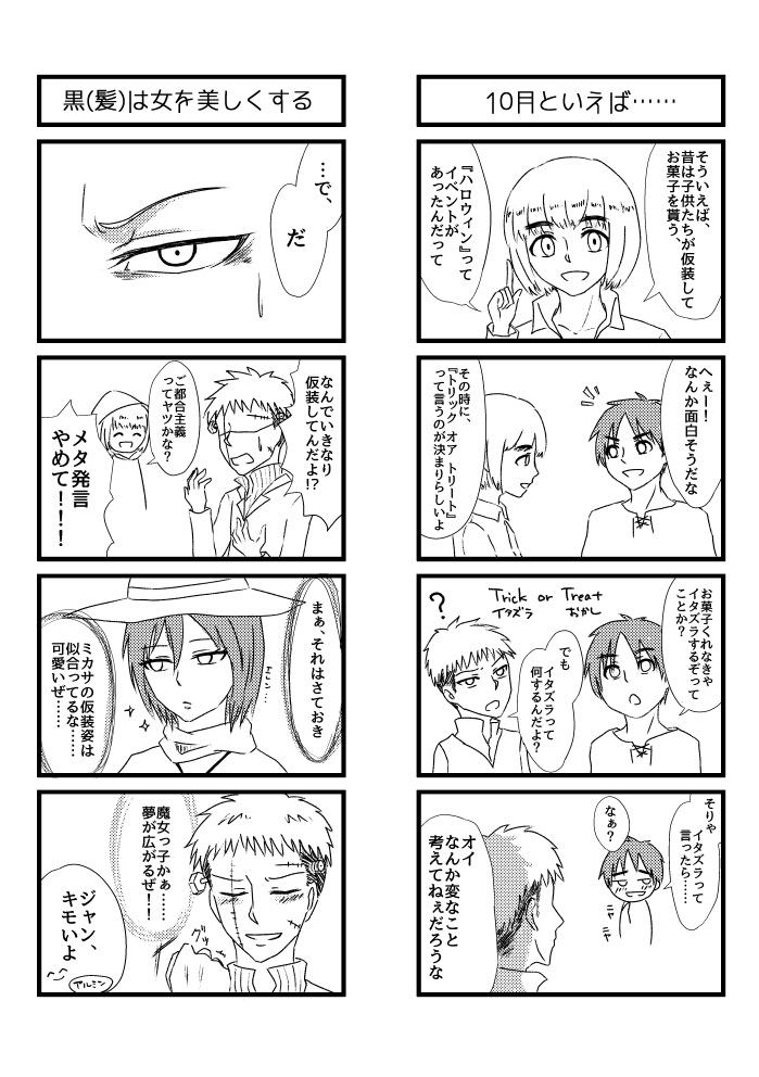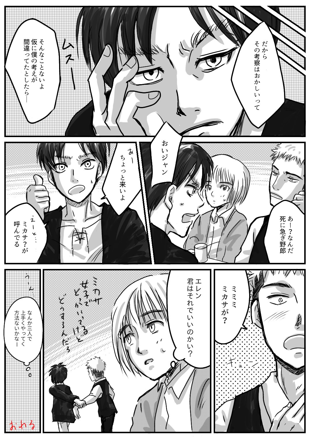 ট ইট র ブビまる フォローさんが素敵なエレジャン漫画を描いていたので私もジャンを描きたくなり 下書きで放置していた漫画のジャンパートを清書してみました 私の中ではジャン君も右の人なんですが相手がリヴァイとなると これは悩む まぁでも限りなく