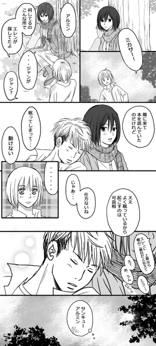 蓮 進撃他マンガ用 ほのぼのアルジャン エレジャンもどき雰囲気マンガ 訓練生後期のイメージなので二人とも幼く アルミン先生がまだ可愛らしい感じです 個人的にはゲスミン好き 一枚目と二枚目で時間を空けてしまって顔が定まってません 親友と