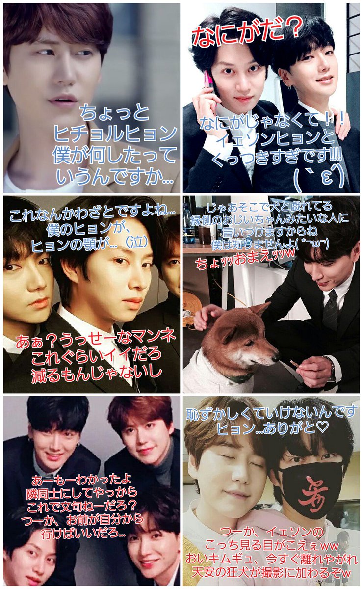 よも A Twitteren 撮影中のヒトコマ 実際はキュヒョンよりもイェソン兄さんの方が嫉妬深いと思う 私の頭の中では ていうか 犬 ジョルちゃんが良かった Sjで妄想 ギュイェ ギュイェ欠乏症 ヤキモチイェソン このあと兄さんに無視されるギュ