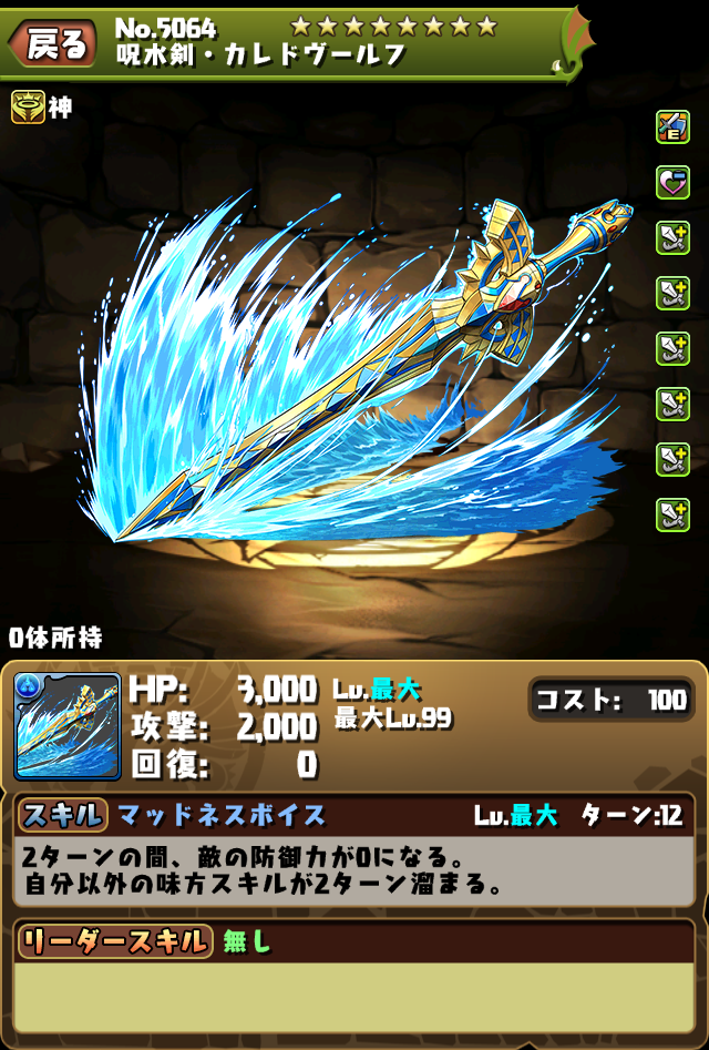 前田慶次(アシスト:カレドヴ―ルフ武器) 5体目が前田慶次(アシスト:カレドヴールフ武器) アシスト目的は「防御力0にする&2ターンヘイスト」 ここは自由枠に近いので、高防御力の敵がいないダンジョンなら変えてもいいと思う。. TOP > モンスター図鑑 > No5064 呪水剣・カレドヴールフ No5064 呪水剣・カレドヴールフ ハドラー ミストバーン. 覚醒スキル 操作時間延長 ドロップ操作時間が少し延びる(1つにつき05秒延長) スキルブースト チーム全体のスキルが1ターン溜まった状態で始まる 封印耐性 スキル封印を無効化することがある(1つにつき%) 回復ドロップ強化 強化された回復.